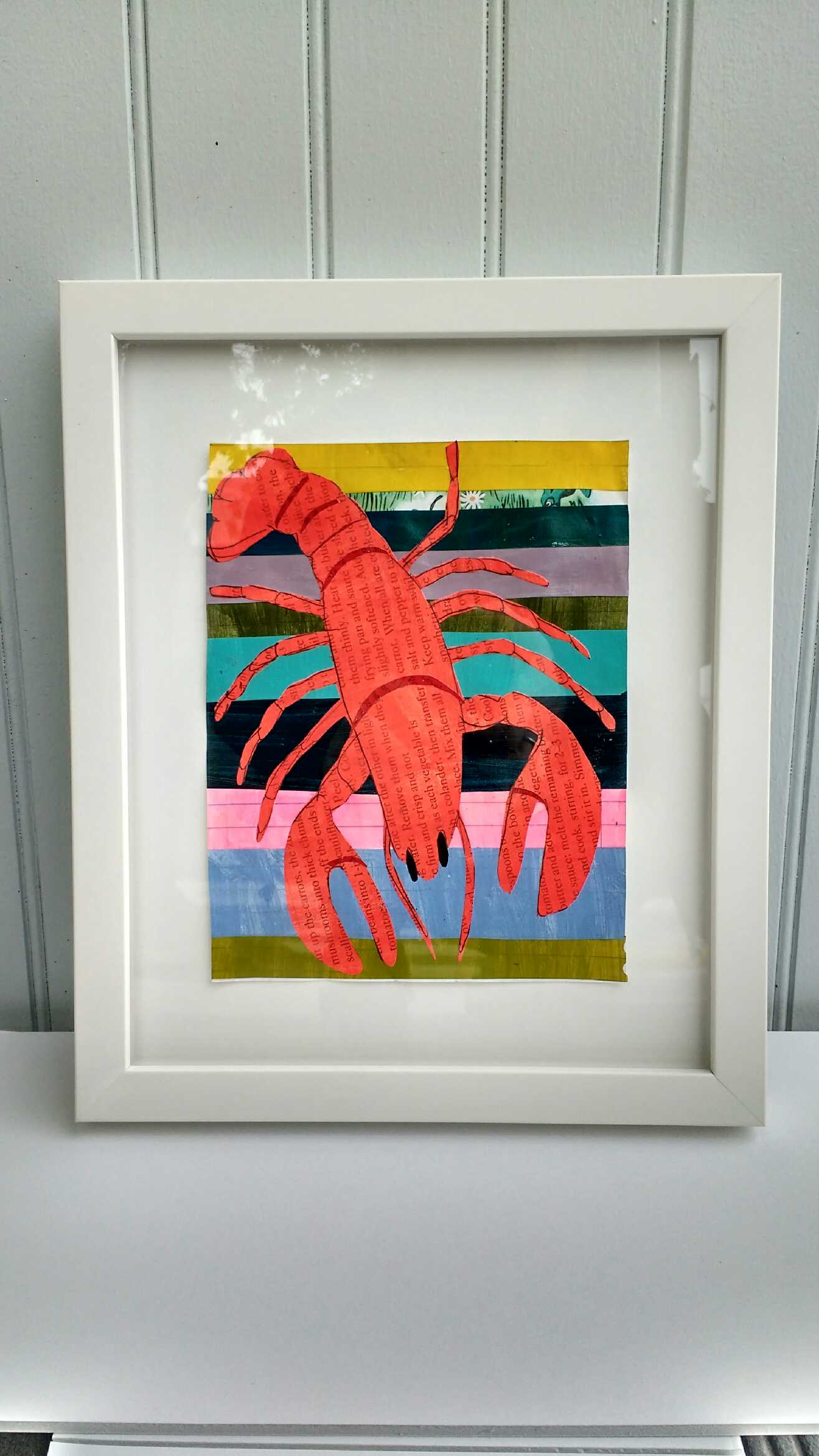 6"x 8" original mixed media by Martha Rich floated in white frame. Finished dimensions 10"x 12". Wired to hang horizontal or vertical, this is truly the lobster art of your dreams.