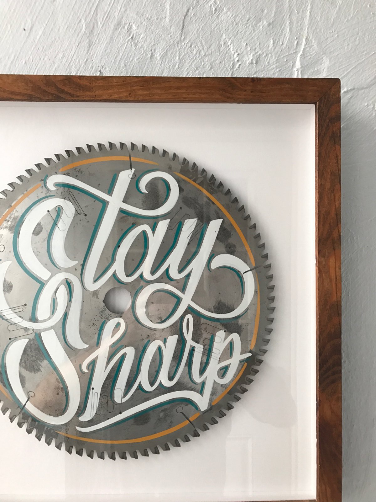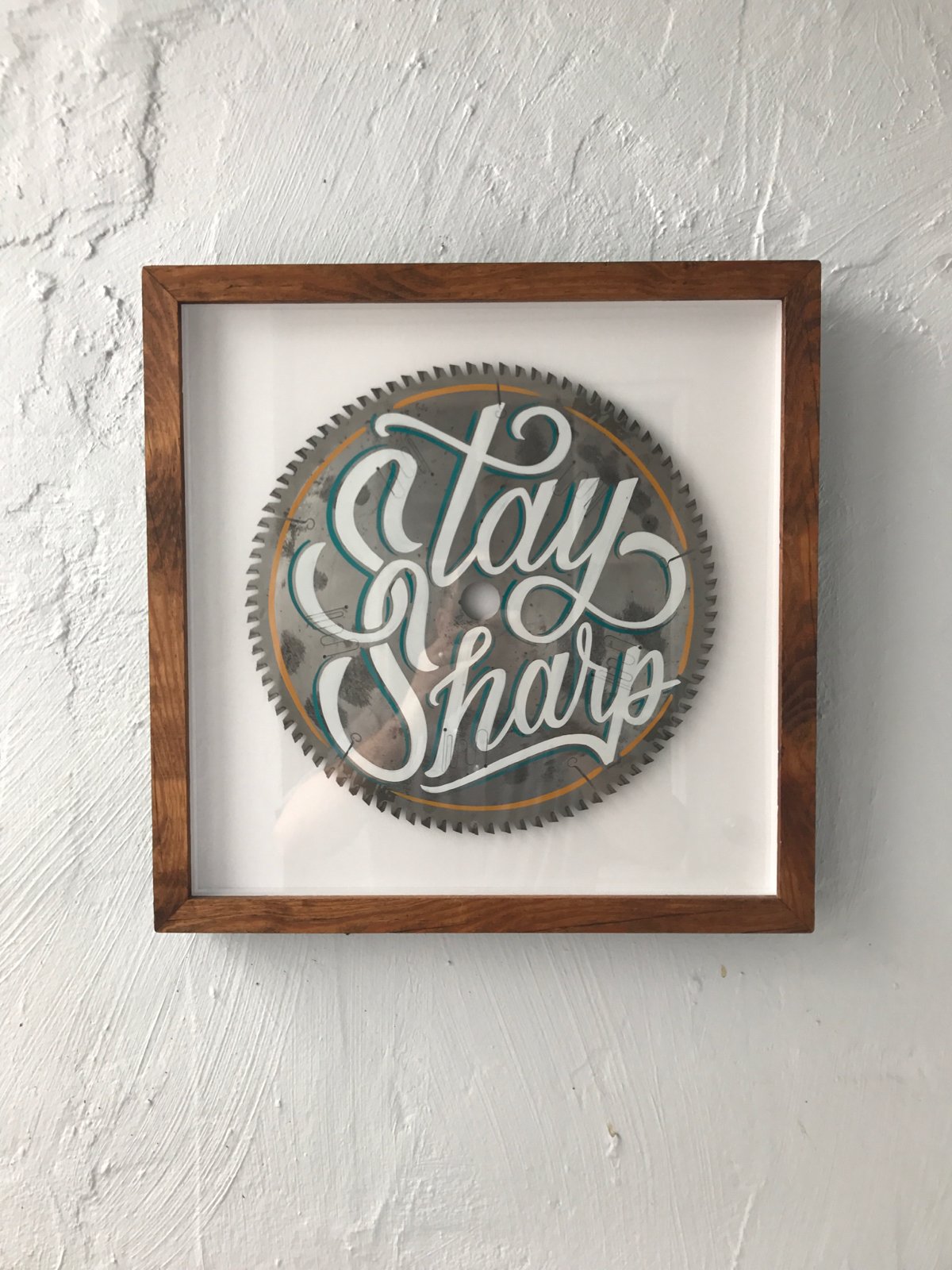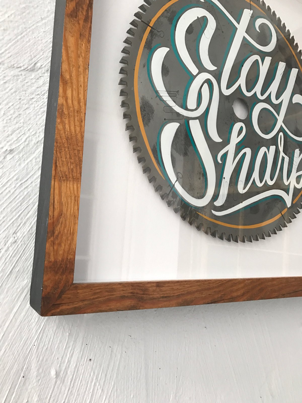 retired saw blade hand painted by Christian Cantiello of Keystone Sign and Co. in reclaimed wood shadow box